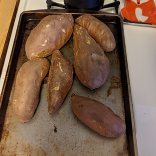 Started off with the sweet potatoes in the oven for about an hour at 400F degrees. While that was baking i took out some musrooms and diced them up and put them in the pan to start cooking out some of the water. Also used that time to take out bacon and diced it up. One the mushrooms cooked down i removed them and added the bacon to let it crisp up. Once the bacon got to my liking i drained the oil and added the mushrooms on low. Then started to cover the mix in maple syrup and mixed it around to get an even coat.